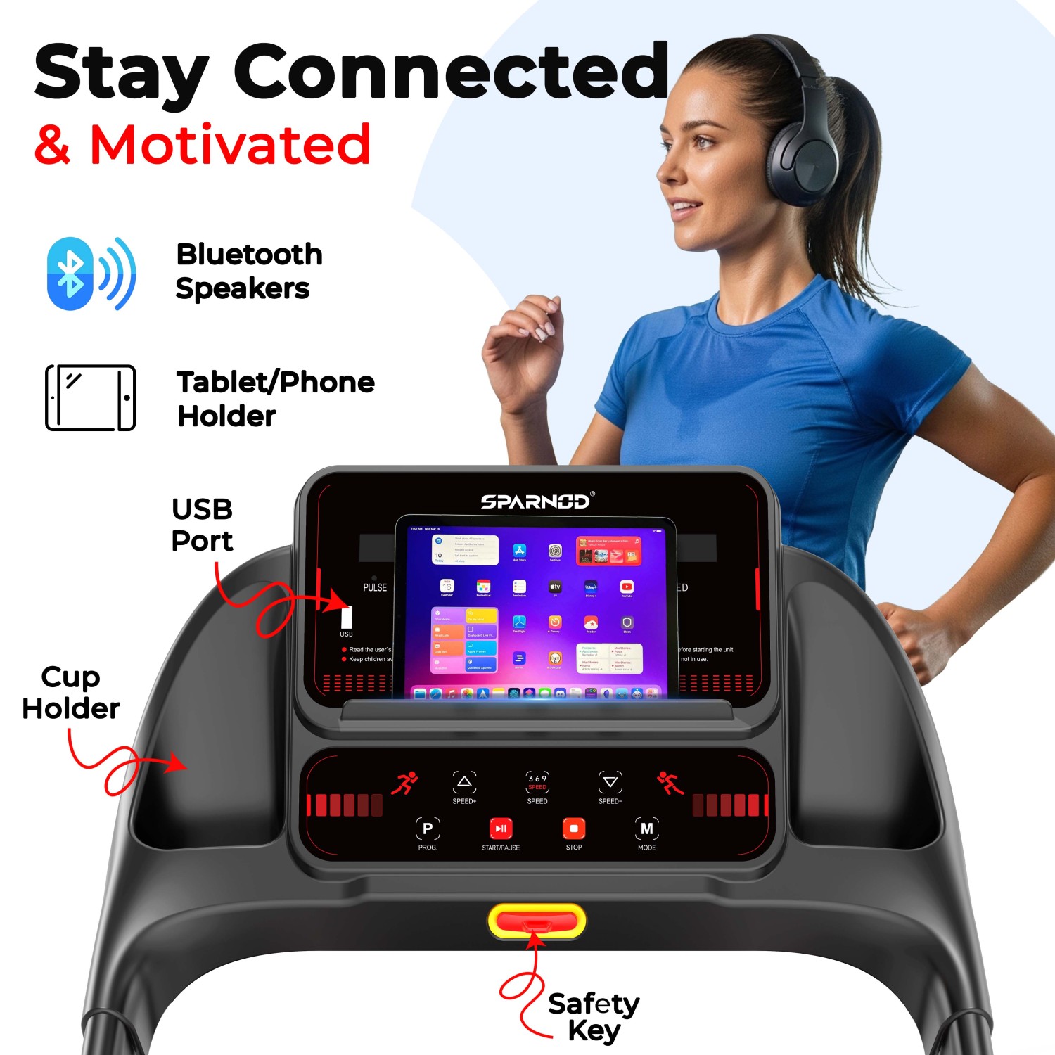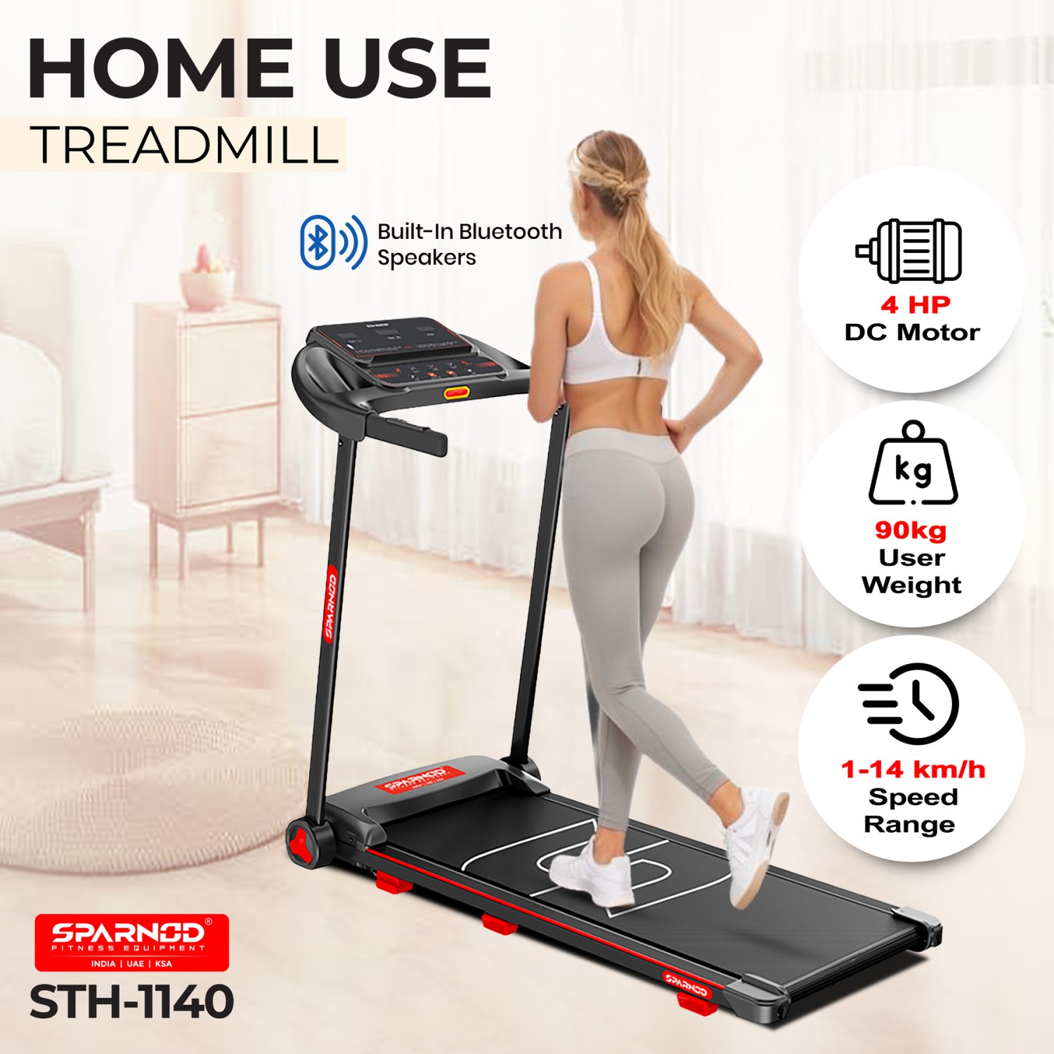 The STH-1140 treadmill is a compact, foldable home fitness machine featuring a 4 HP DC Motor, 12 preset programs, and a multi-LED display with functions like pulse, speed, time, and calories. It supports users up to 90kg and includes Bluetooth speakers, handrail pulse sensors, manual incline, and a silicone rubber shock absorption system for a smooth workout. With its sleek black and red design, easy mobility, and AC power support, it's ideal for efficient indoor cardio training.