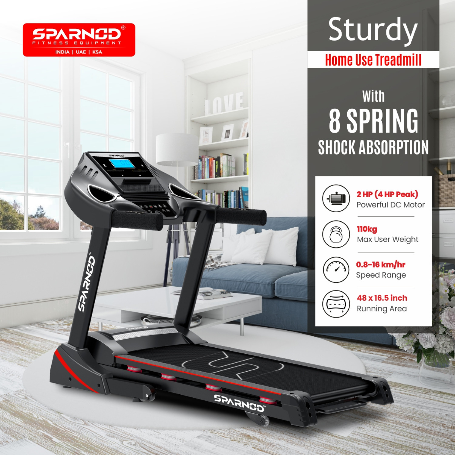 The STH-3400 is a highly durable and sturdy treadmill that can support users up to 110 kg. It has a large running area of 1240 x 420 mm and an incline range of 15%. The speed range is 0.8-16 km/hr, making it perfect for both beginner and experienced runners. The 5' LCD display shows all the necessary information about your workout, and the treadmill can be easily folded away when not in use. It comes 1 year warranty.