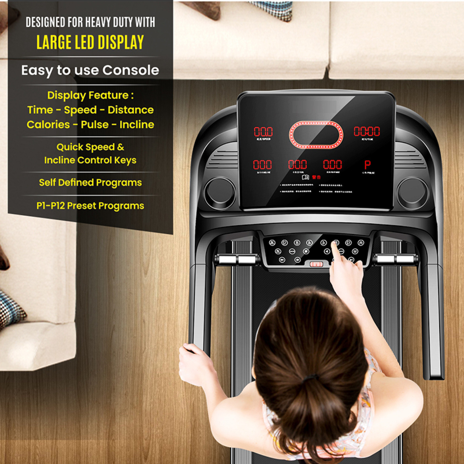 The STH-5700 is a powerful 3 HP DC motor large LED display treadmill with automatic incline. This treadmill is perfect for anyone who wants an easy and convenient way to work out. The user weight limit is 140kg and the running area is 1360x520mm/54x20inch. The incline range is 15% (auto) and the speed range is 1-18km/hr. The foldable hydraulic frame makes it easy to store and transport, even when folded up.