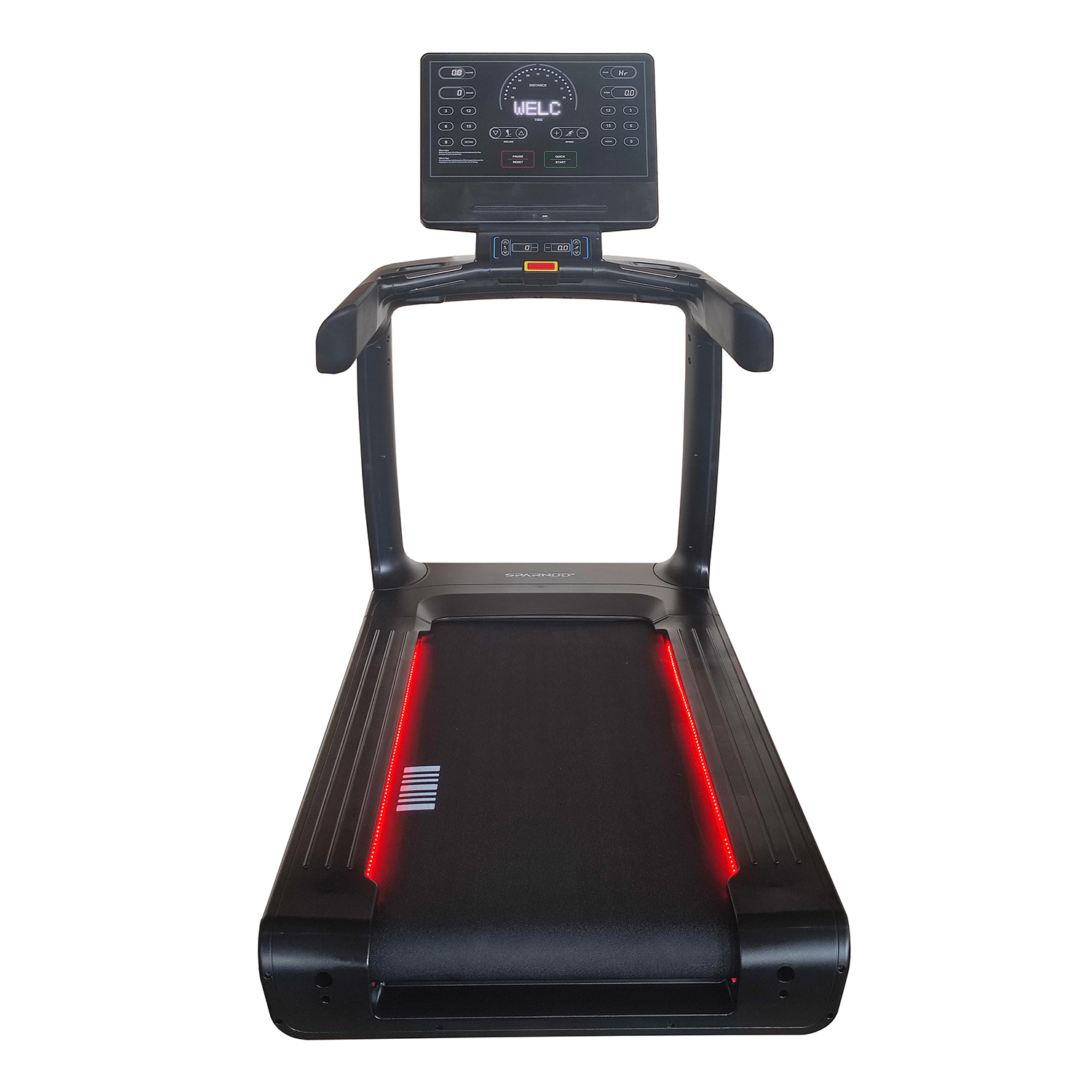 The STC-5900 commercial treadmill features a powerful 3HP continuous (7HP peak) motor, 1–20km/h speed range, 0–20% incline, and a spacious running surface with 2.5mm belt thickness. It includes a 21.5-inch LED display with speed, slope, calories, and mode functions, plus USB music, inbuilt speakers, and handheld heart-rate sensors. Built with a sturdy 180kg user capacity, non-foldable design, dual-package wooden crate protection, and 1-year warranty.